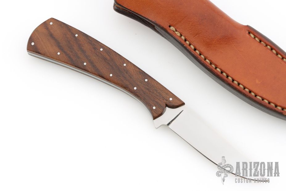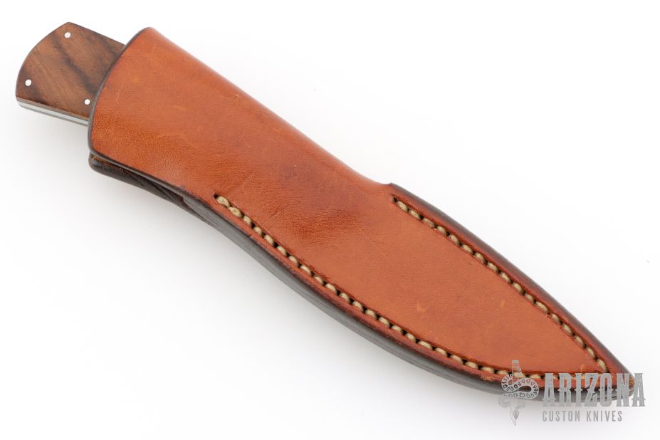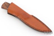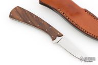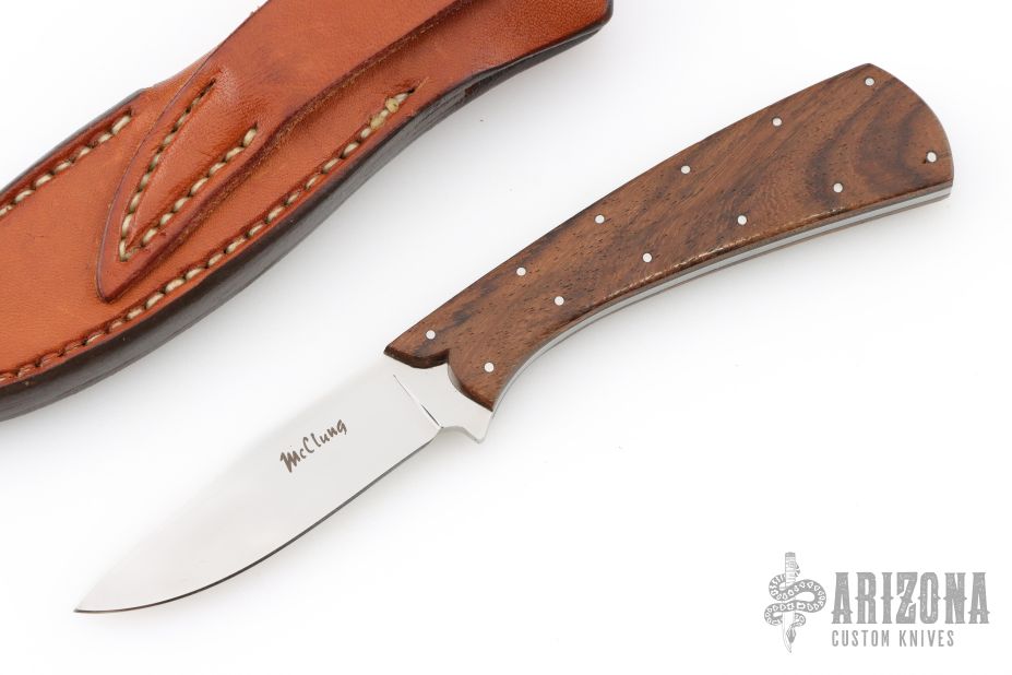 This knife by Mac McClung features a polish finished drop point blade with .120" bladestock and .70" blade depth, full tang construction. The handle has pinned walnut scales. Comes with a leather belt sheath. The knife has a couple light scratches, excellent condition otherwise.