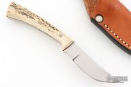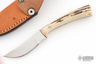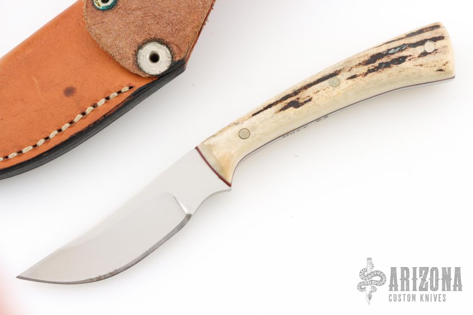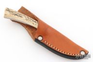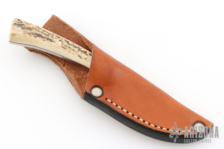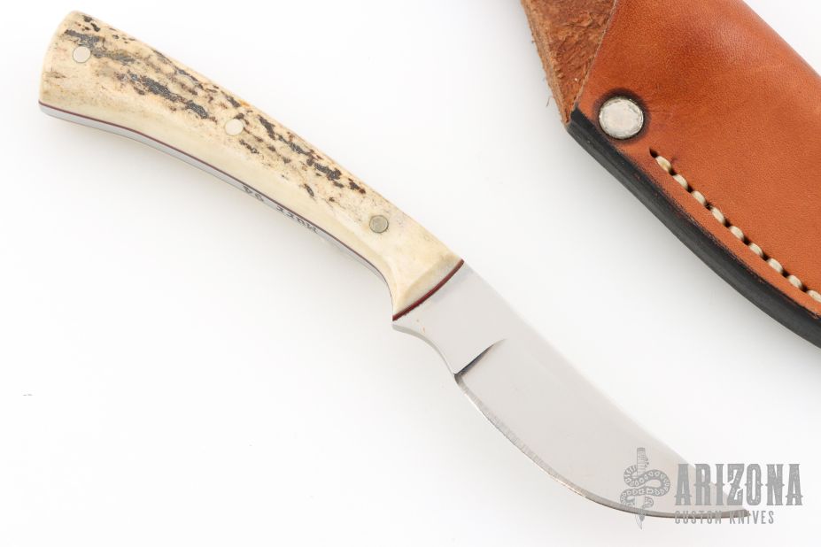 This knife by Keith Murr features a polish finished drop point blade with .136" bladestock and .785" blade depth, full tang construction. The handle has pinned stag scales. Comes with a leather belt sheath. The knife has a couple light scratches, excellent condition otherwise.
