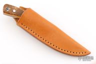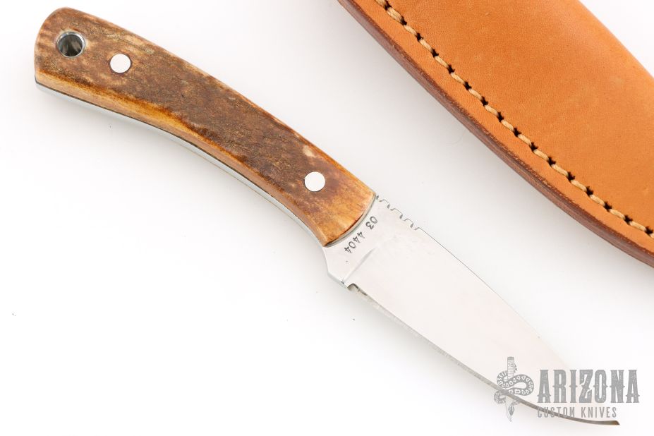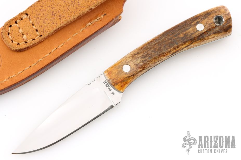This knife by Marvin Poole features a polish finished drop point blade with notched thumb rest, .135" bladestock and .881" blade depth, full tang construction. The handle has pinned stag scales. Comes with a leather belt sheath. The knife has a couple light scratches, excellent condition otherwise.