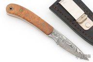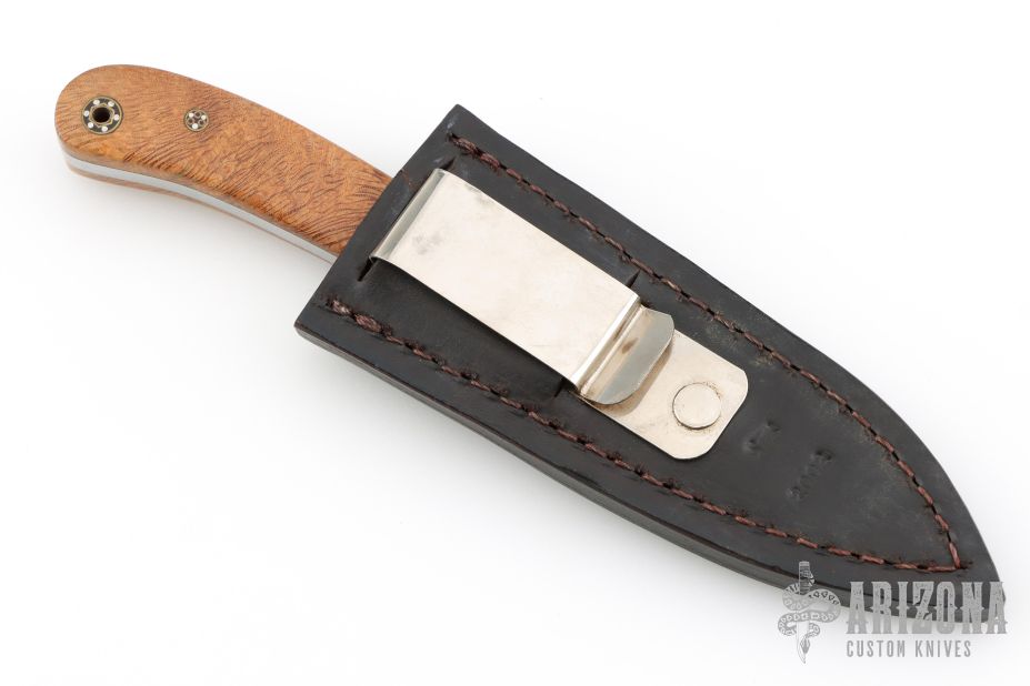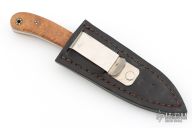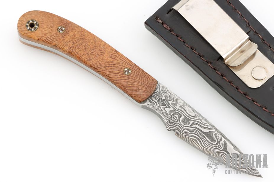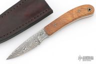 This knife by Stek Knives features a Damascus blade with .202" blade stock and .841" blade depth, full tang construction. The handle has tapered oak burl scales with mosaic pins. Comes with a brown leather sheath with belt loop. Excellent condition.