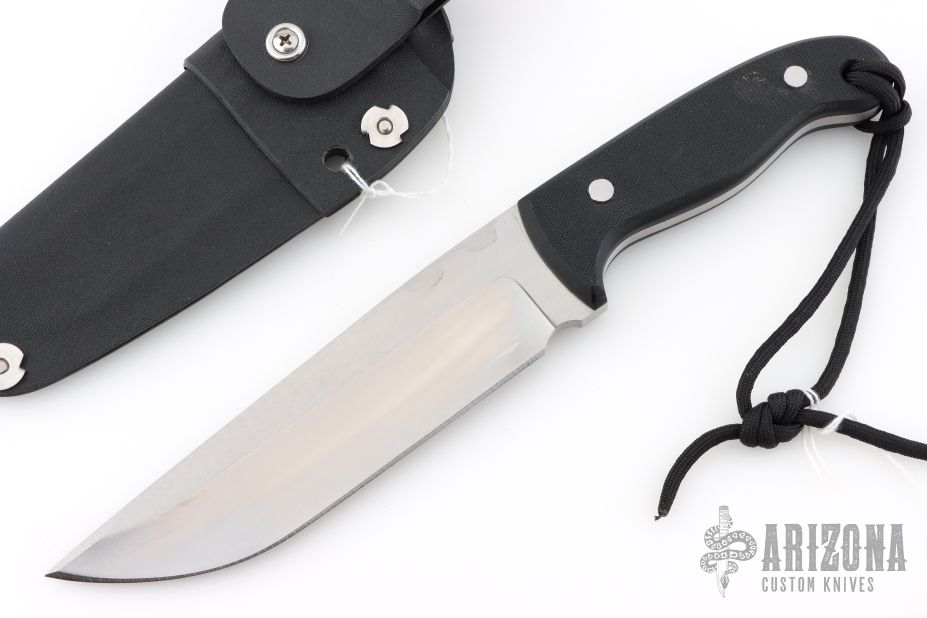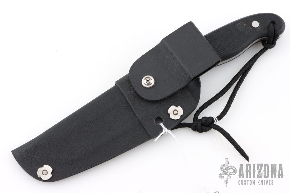 This Prototype knife by Rob Criswell features a satin finished blade with .250" blade stock and 1.742" blade depth, full tang construction. The handle has black G-10 scales. Comes with a kydex sheath. Has some light scratches, otherwise excellent condition.