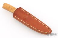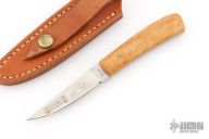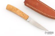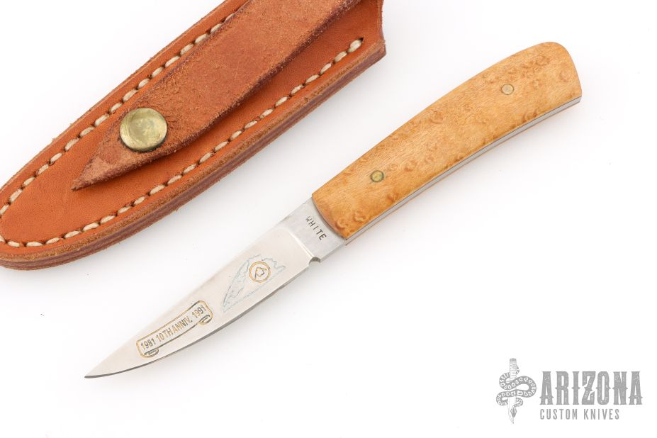 This knife by Gene White features a satin finished tailing point blade with .128" bladestock and .607" blade depth, full tang construction. The handle has pinned Birds Eye Maple covers. Comes with a leather sheath. The knife has a couple light scratches, excellent condition otherwise.