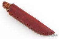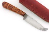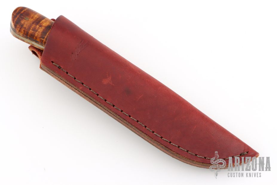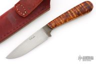 This hunter by Billy Watson features a hand rub satin finished blade with fileworked spine and a flared out guard below the ricasso, .123" blade stock and 1.005" blade depth, full tang construction. The handle has curly maple wood scales. Comes with a brown leather sheath.  Scratches and oxidation are visible. Has some light scratches, excellent condition otherwise.