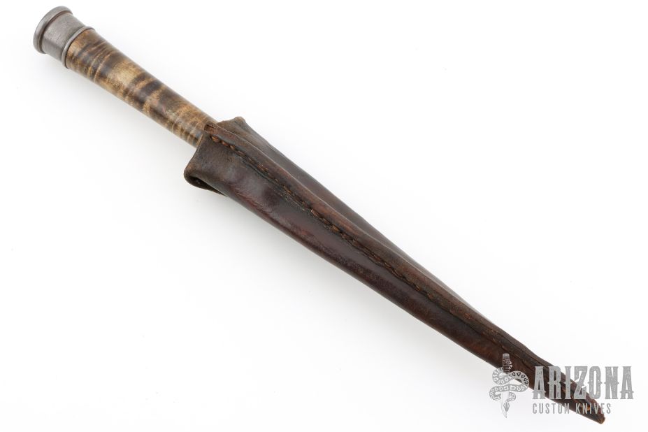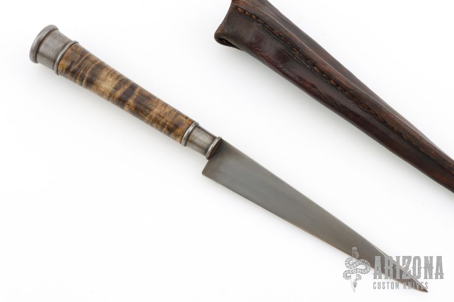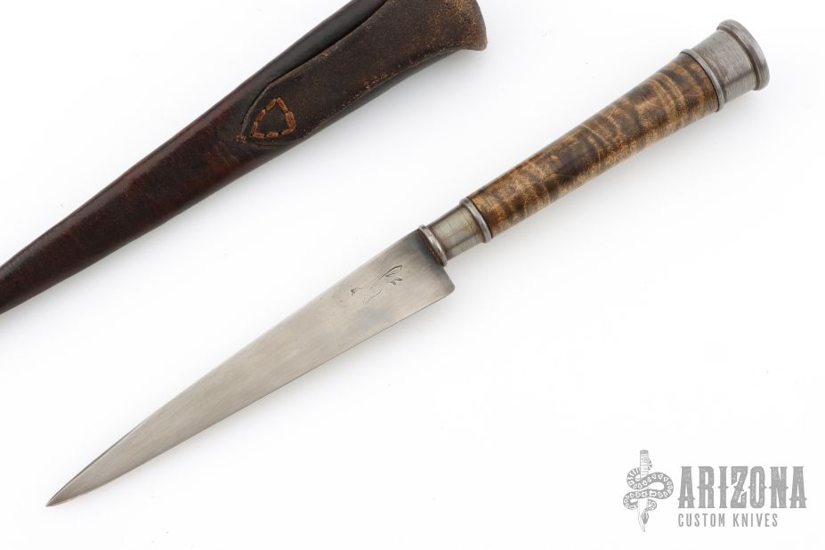This Dirk by Swamp Fox Knives features a forged satin finished wharncliffe style blade with .198" blade stock and .913" blade depth. The handle is comprised of a pewter ferrule and pommel with curly maple handle and hidden tang construction. Includes brown leather sheath with belt loop. Has some light scuffs and scratches, excellent condition otherwise.