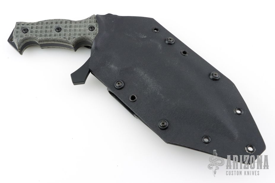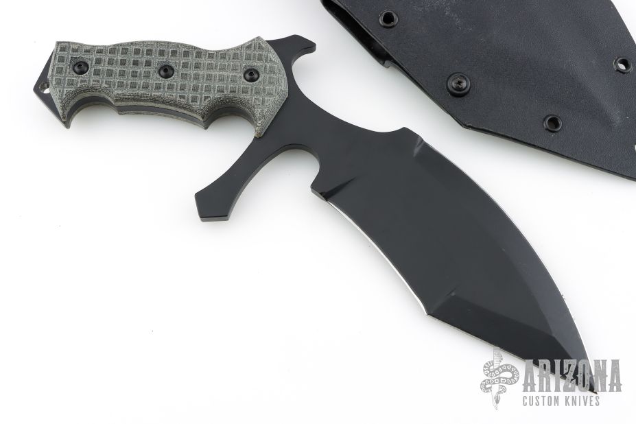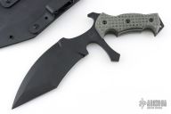 This Vampire UUK is a Laci Szabo design made by Robert Martin. It features a black coated double-edged blade, .277" blade thickness and 2.598" blade depth, full tang construction. The handle has black micarta scales with frag pattern. The UUK, or Urban Utility Knife is the most well-known of Laci Szabo's designs. One mean field-tested tactical. Comes with kydex sheath with belt loops. New from maker.