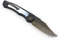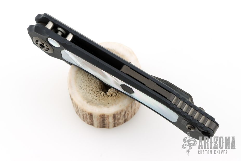 This Wraith V4 Auto by Heretic Knives features a high sheen DLC tumble finishedblade with DLC satin flats, milled fullers and a notched thumbrest. The handle has a black hefted aluminum frame with mother of pearl inlays, orange peel finished DLC stainless steel backspacer and titanium clip, left/right reversible. Mother of pearl inlaid button. Comes with original box, zippered case and COA dated 03/2024 and #010. Excellent condition.