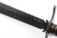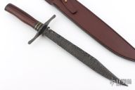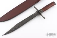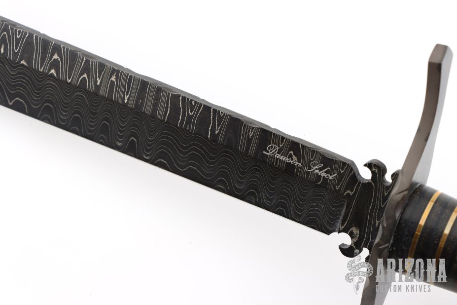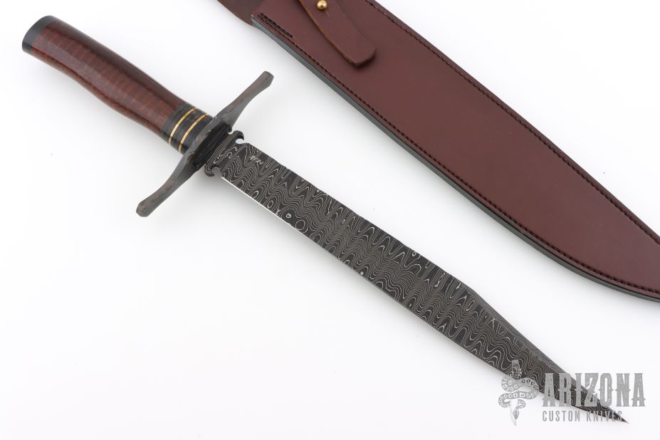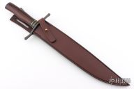 This Kit Carson Bowie from Dawson Select features a Damascus blade with fileworked spine and false top edge, .184" blade stock and 1.434" blade depth, hidden tang construction. The handle has a black fileworked steel guard, Brazilian Snakewood grip with a carbon fiber butt, black leather and brass spacers. Includes a brown leather sheath and COA dated 2024. Excellent condition.