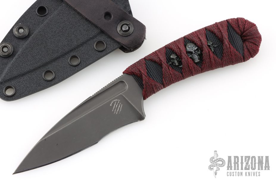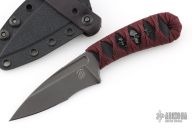 This SIN by Bastinelli Knives features a blackwashed blade with notched thumbrest and fullers, .138" blade stock and 1.246" blade depth, full tang construction. The handle has a custom cord wrap and a menukis. Comes with kydex sheath. Excellent condition.