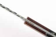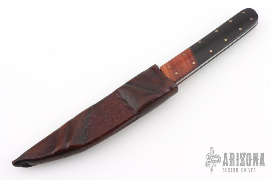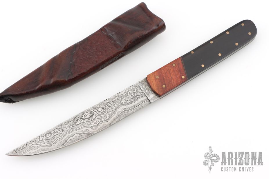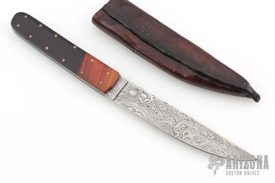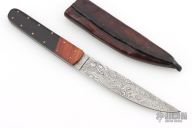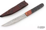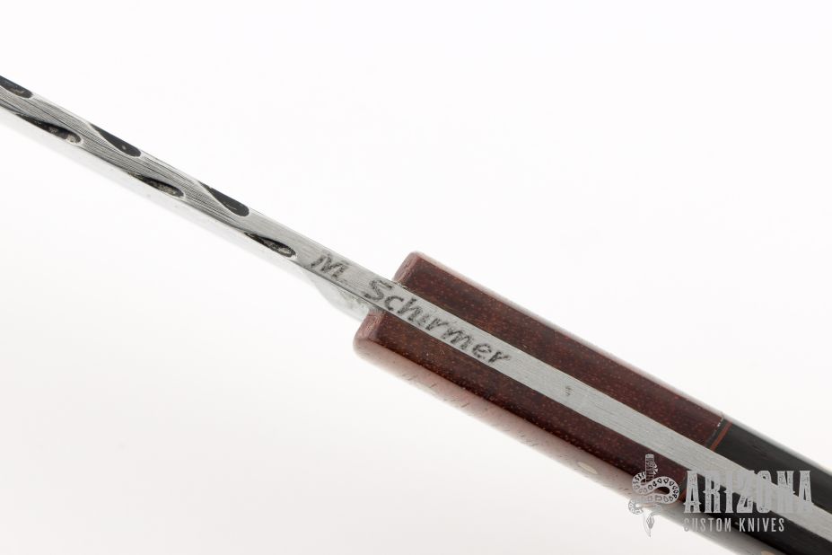 This Tanto by Mike Schirmer features a hand forged Damascus blade with .128" blade stock and .9" blade depth, tapered tang construction. The handle has wood bolsters and covers with brass pins. Comes with original leather sheath. Excellent condition. Blade is marked M. Shirmer on the spine at the bolster, and the sheath is also marked Shirmer at the belly.