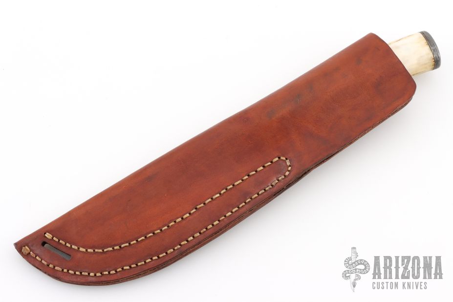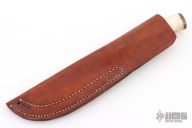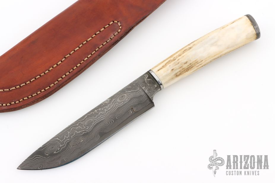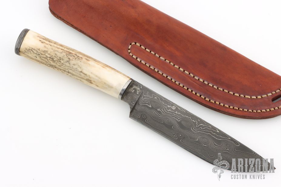 This hunter by Harry Noel features a Damacus blade with steel collar, .258" blade stock and 1.325" blade depth, hidden tang construction. The handle has a stag grip and a Damascus butt. Comes with a brown leather sheath. Has a light patina. Excellent condition.