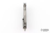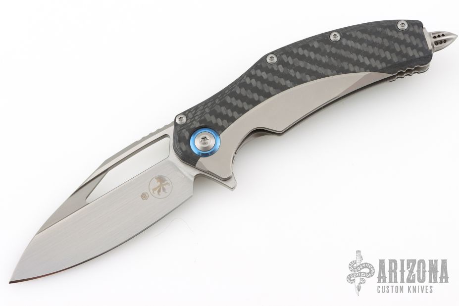 This Matrix flipper by Microtech features a hand rub satin finished blade with a notched thumbrest and flipper. The handle has a titanium frame, carbon fiber inlays, and anodized titanium pivot collars. Comes with original box and papers. Nice detent, lockup and blade seating. Excellent condition.