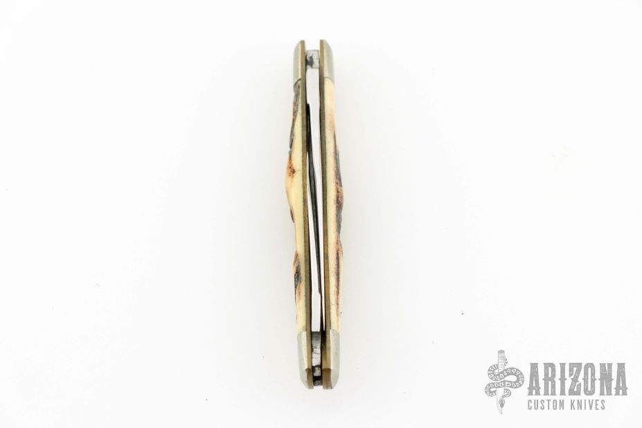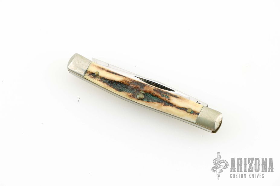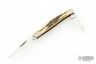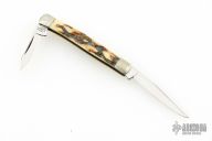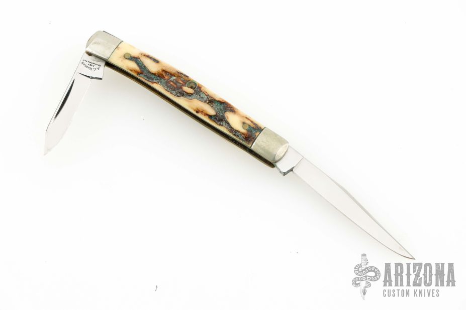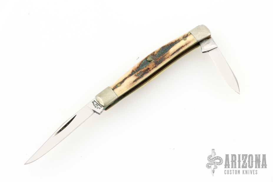 This Mini Muskrat by AG Russell features mirror polished blades with nail nicks. The handle has fluted nickel silver bolsters, stag covers, brass liners and stainless steel spring. Has a couple light scratches, otherwise excellent condition.