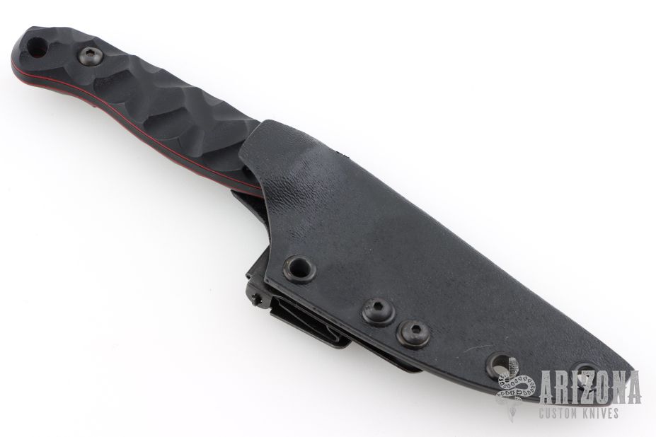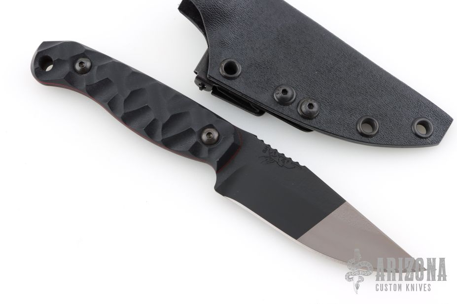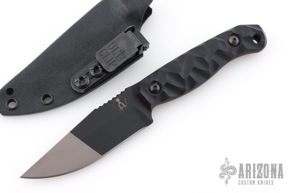 This Uncharted Supply Co Featherlite by Half Face Blades features a black/grey cerakoted blade with a notched thumbrest, .128" blade stock, 1.149" blade depth, full tang construction.  The handle has black G-10 scales.  Comes with original box, papers and kydex sheath with clip. Excellent Condition.