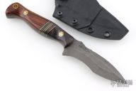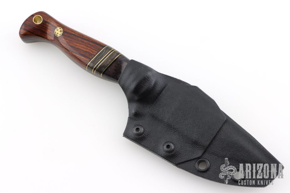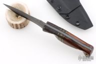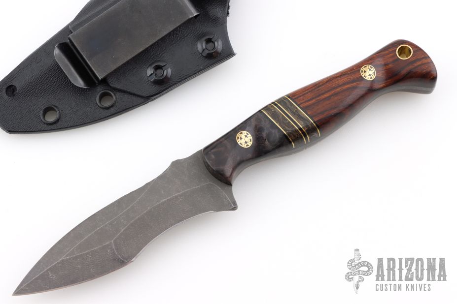 This Extremis by Half Face Blades features a dark tumble finished blade with a rock textured thumbrest, .138" blade stock, 1.205" blade depth, full tang construction.  The handle has dyed maple burl bolsters, ironwood scales, black liners, black/brass/carbon fiber spacers. Comes with original box, papers and kydex sheath with clip. Excellent condition.