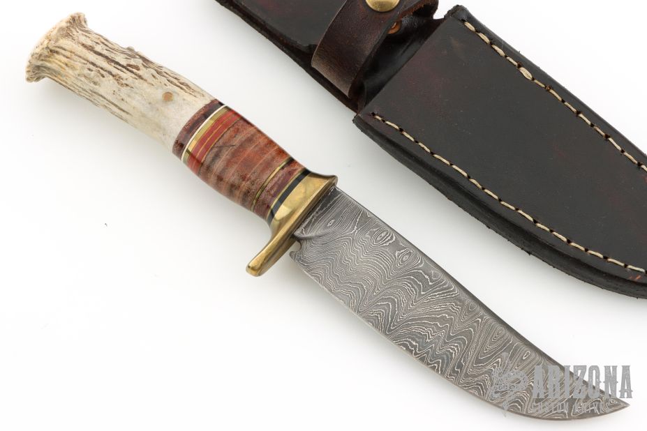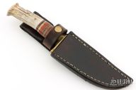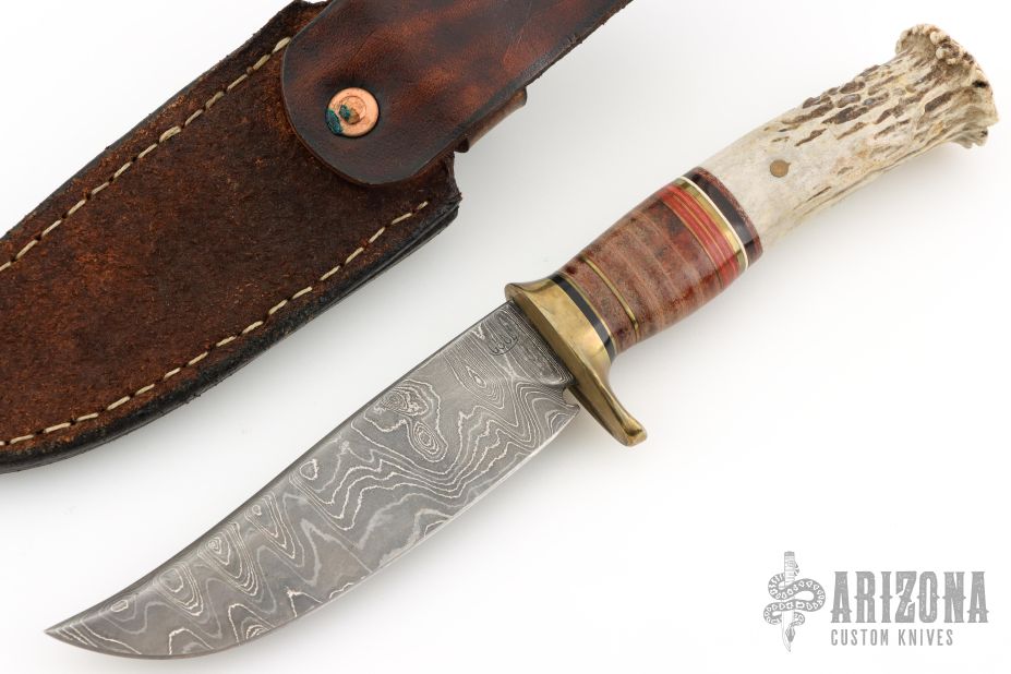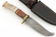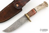 This hunter by DR Good features a Damascus blade with .135" blade stock and 1.263" blade depth, hidden tang construction. The handle has a brass guard, crown stag butt and a spacer pattern consisting of black/brass/white/red/leather. Comes with a brown leather sheath. Has a couple light scratches, otherwise Excellent condition.