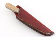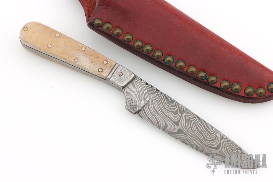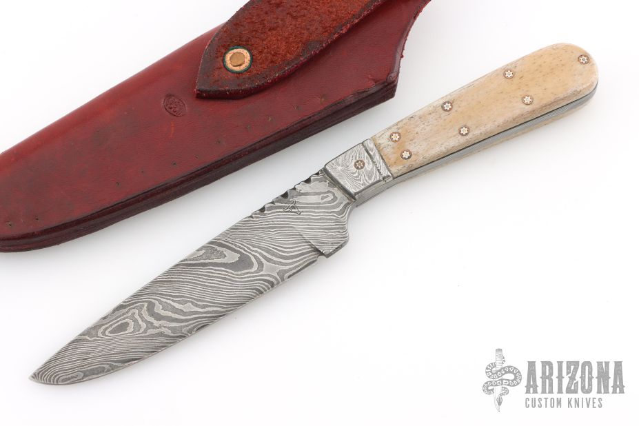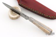 This knife by DR Good features a drop point Jeff White Damascus blade with a full tang construction.  .180" Blade Stock.  1.039" Blade Depth.  The handle has Damascus bolsters, with bone covers and mosaic pins. Includes a brown leather sheath. Has some light scratches, Excellent Condition.