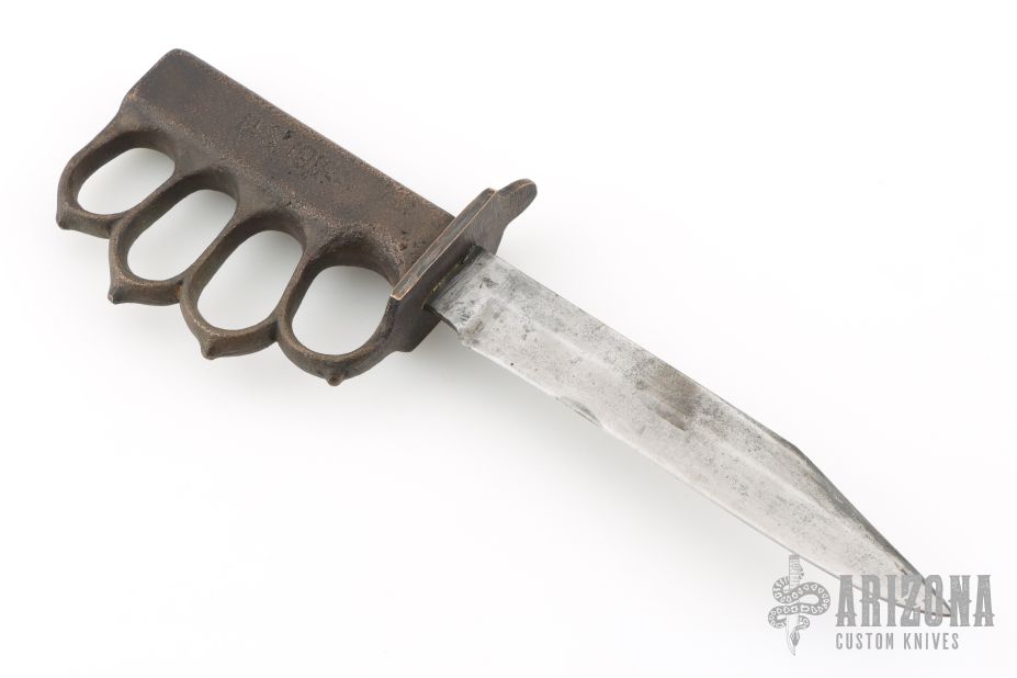 This Trench Knife features a NON-XLL blade from approximately 1880-1890 by Joseph Allen & Sons of Sheffield England that has been put in a US1918 trench knife handle. It has a satin finished clip point blade with false top edge, .165" blade stock and 1.018" blade depth, hidden tang construction. The handle is cast brass knuckle handle. Has scratches and patina, has been resharpened, otherwise good condition.