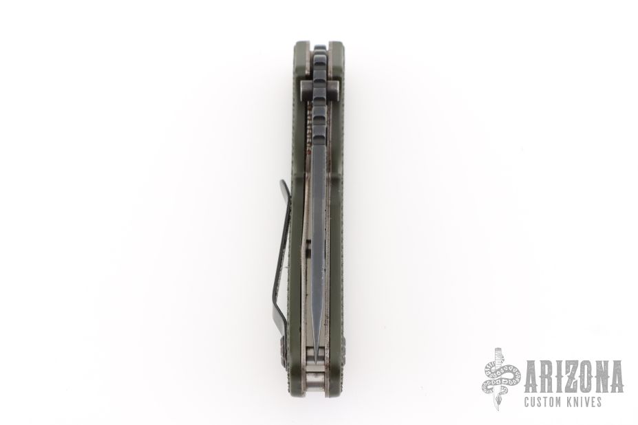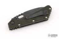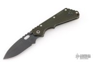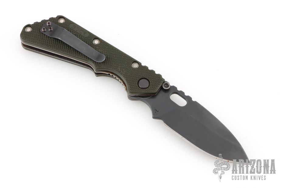 This is a Buck made Strider SNG with black coated blade and dark green scales, stainless steel liners, black coated stainless steel tip up reversible carry clip. Notched thumbrest area and front/rear of handle provide a solid grip. Has some light scuffs, excellent condition otherwise.