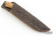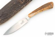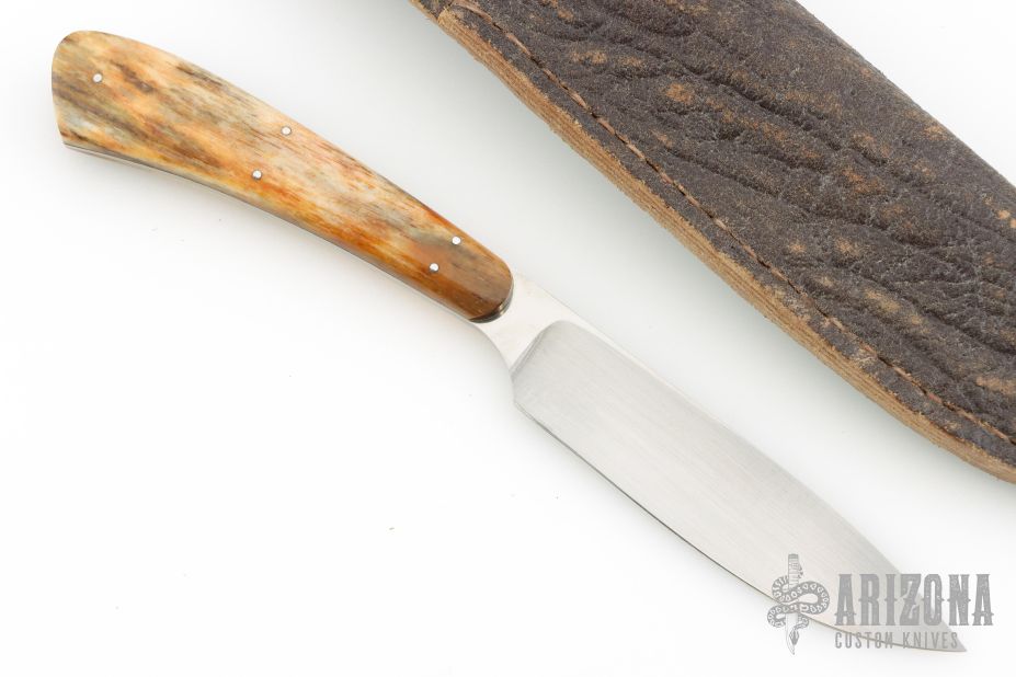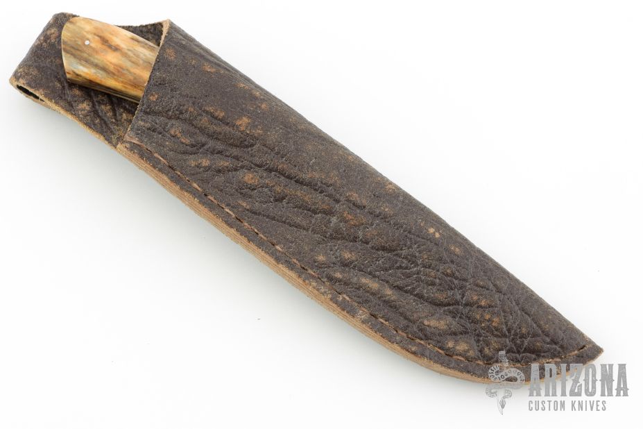 This Skinner by Arno Bernard features a hand rub satin finished drop point blade with .124" blade stock and .877" blade depth, tapered tang construction. The handle features pinned giraffe bone scales. Comes with leather belt sheath. Has a couple light scratches, excellent condition otherwise.