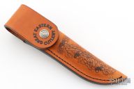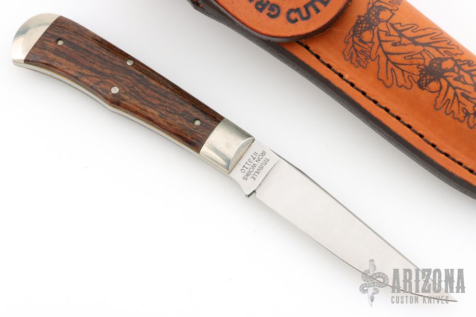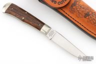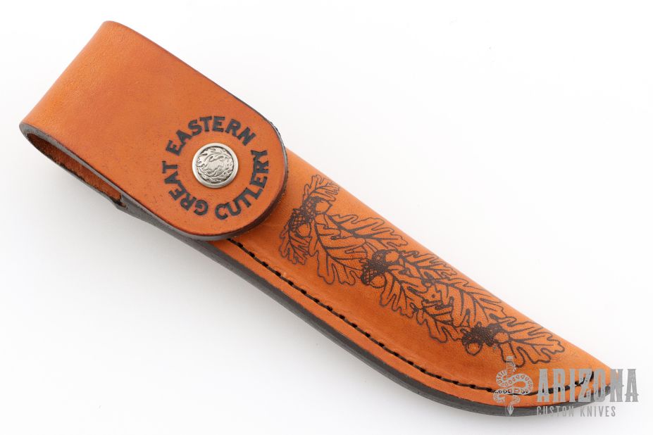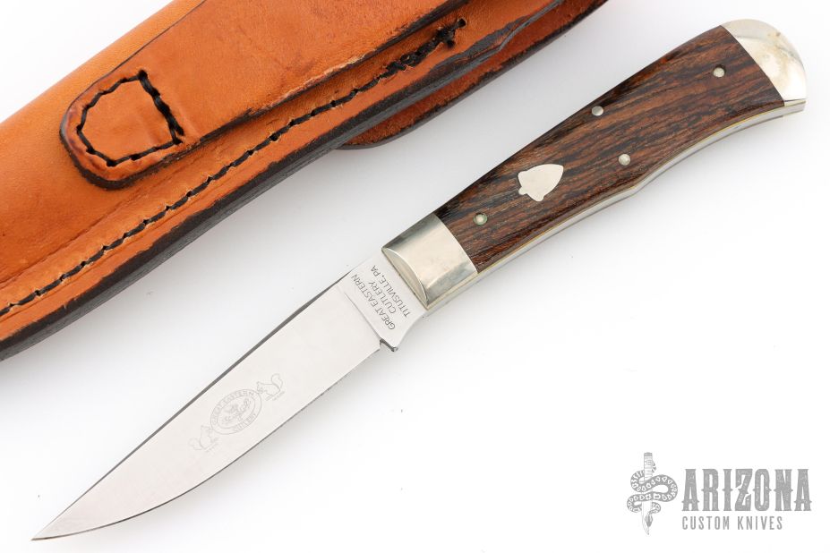 This knife by Great Eastern Cutlery features a satin finished blade with .110" blade stock and .754" blade depth, full tang construction. The handle has nickel silver bolsters, caps, wood scales and brass liners. Comes with a brown leather sheath and original packaging. Excellent condition.