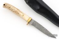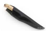 This knife by DR Good features a drop point Damascus blade with a full tang construction. .104" Blade Stock.  .624" Blade Depth.  The handle has a brass guard, brass pins, stag covers, and lanyard hole in pommel. Includes a leather sheath. Has a light patina. Excellent condition otherwise.