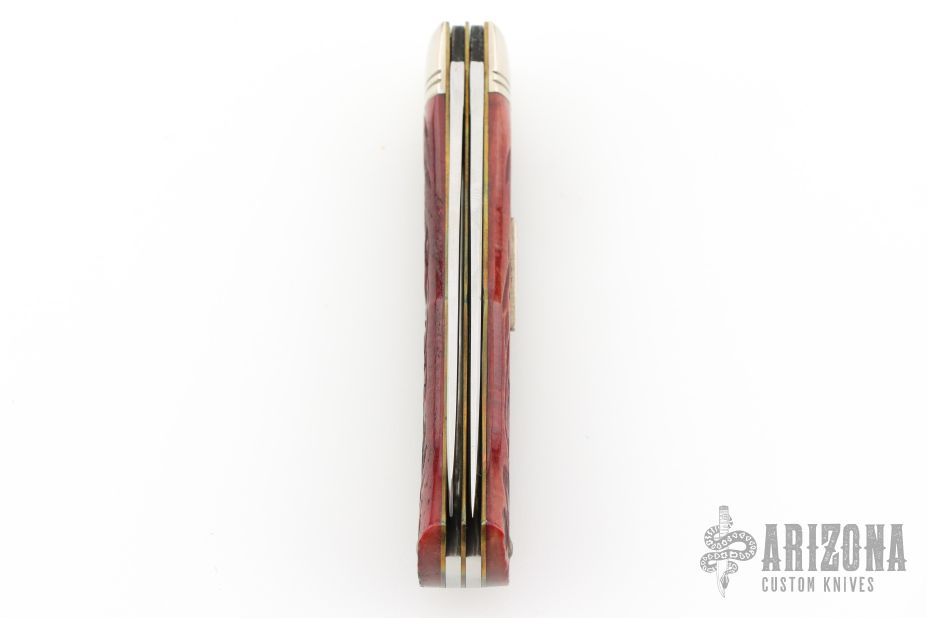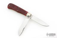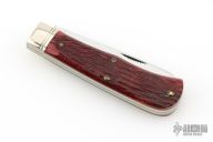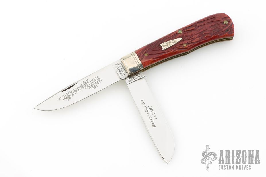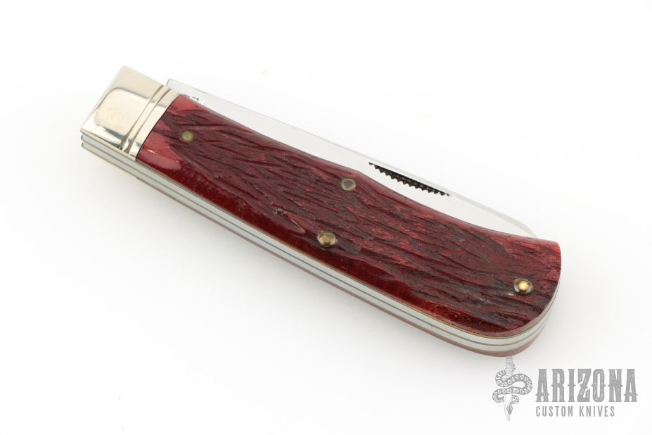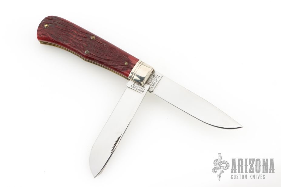 This slipjoint by Schrade features mirror finished blades with nail nicks. The handle has fluted nickel silver bolsters, groove bone covers, brass liners and stainless steel springs. Comes with original box, and papers. Has a few light scratches and some patina, otherwise excellent condition. #182