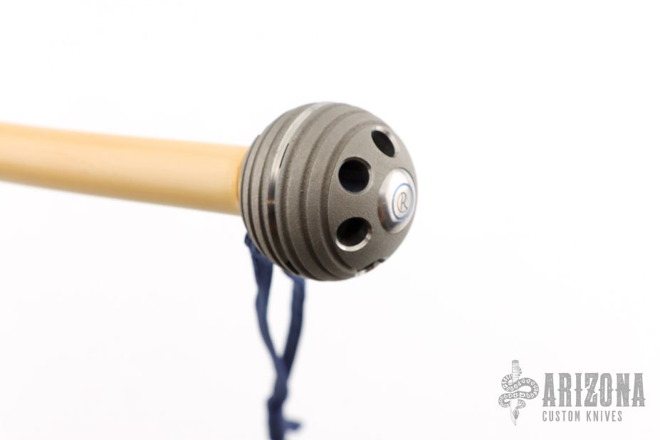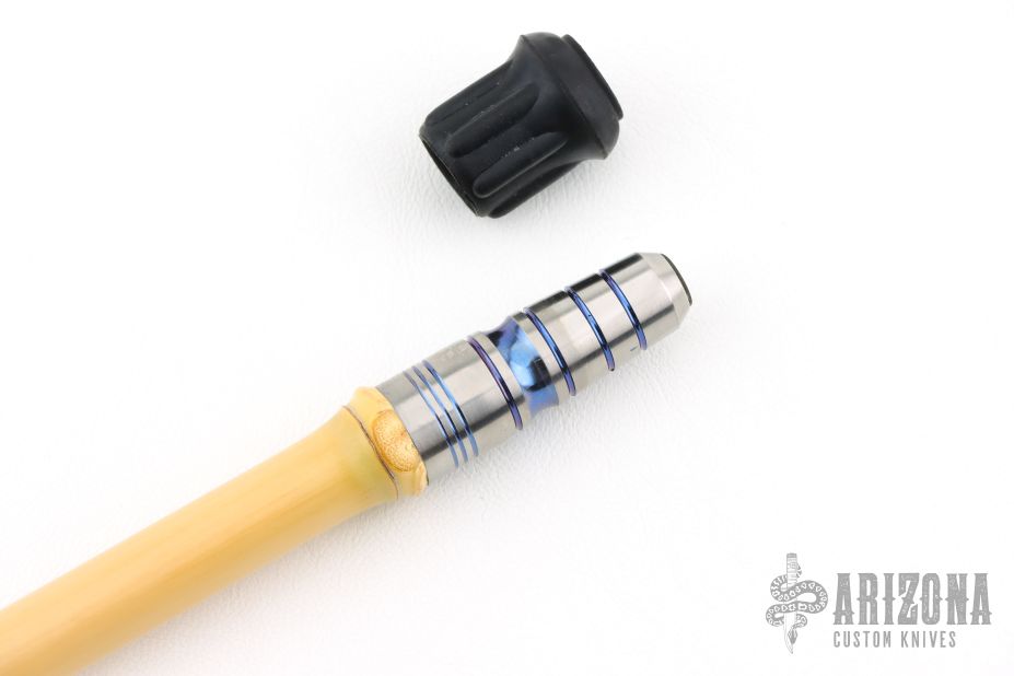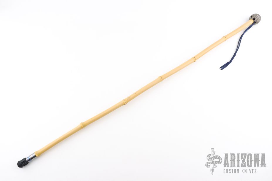 This cane has a two-tone titanium ball, bamboo shaft and two-tone anodized titanium tip. Overall 40". Excellent condition. Has a cloth pouch.