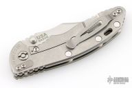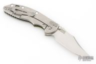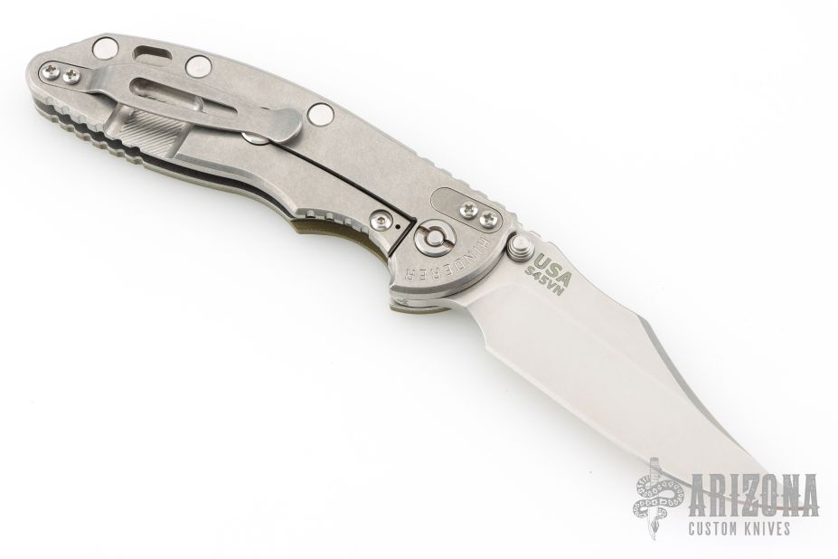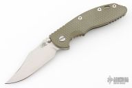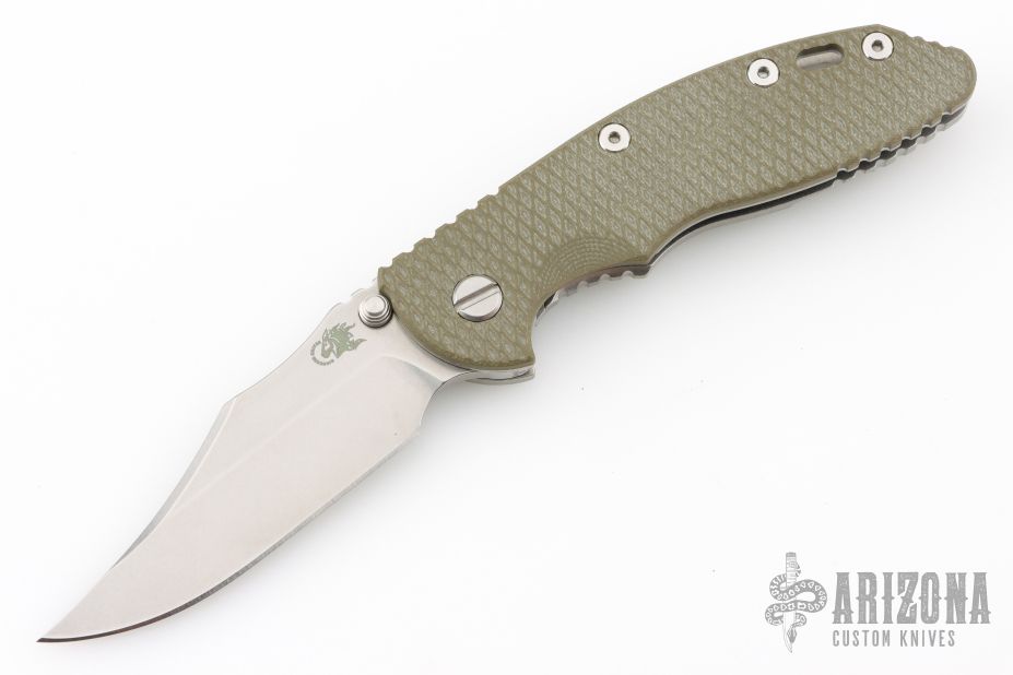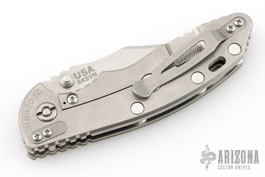 This XM-18 Bowie by Rick Hinderer Knives features a 3.5" stonewash finished blade, notched thumbrest and dual thumbstuds. The handle has a green G-10 scale, and a stonewashed titanium handle/clip. Clip can be mounted for tip up or down carry. Tri-way pivot system. Nice lockup, and detent. Includes the original box, card, and extra washers. Excellent condition.