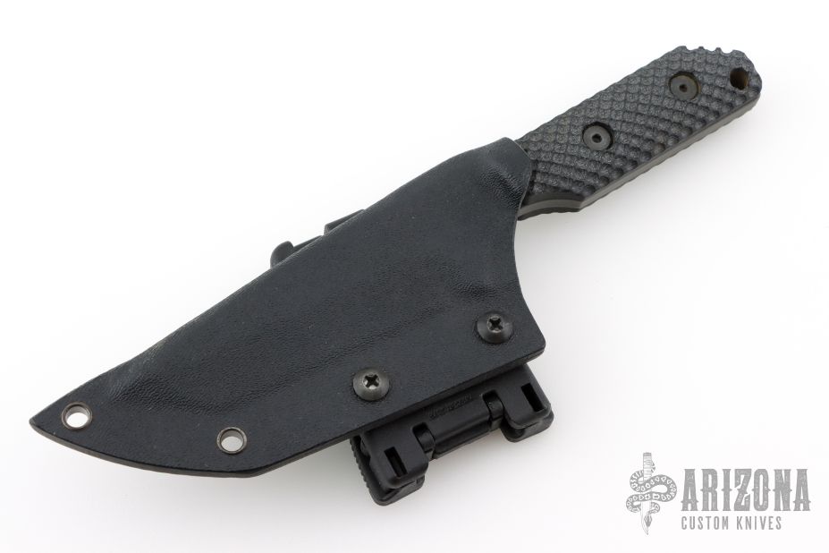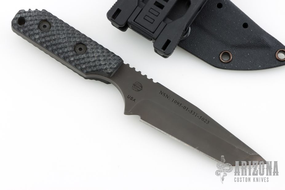 This DB-L from Strider Knives features a clip point tanto style blade with black finish and notched thumbrest, .198" blade stock and 1.255" blade depth, full tang construction. The handle is comprised of black G-10 gunner grip scales. Comes with kydex sheath. Has light scuffs and scratches otherwise Excellent condition. NSN-1095-01-531-5023