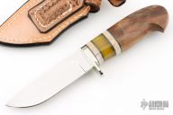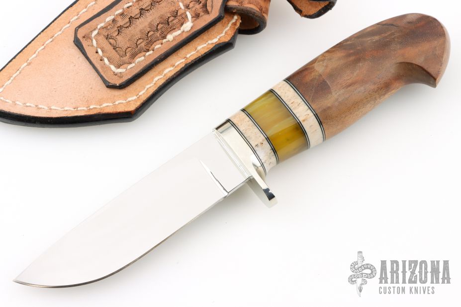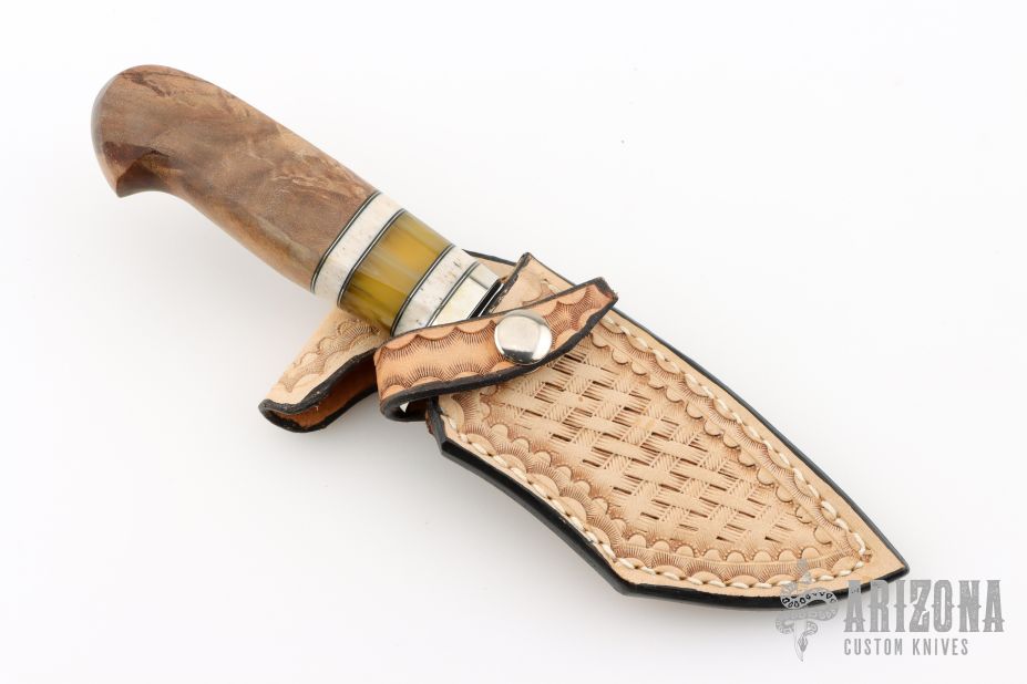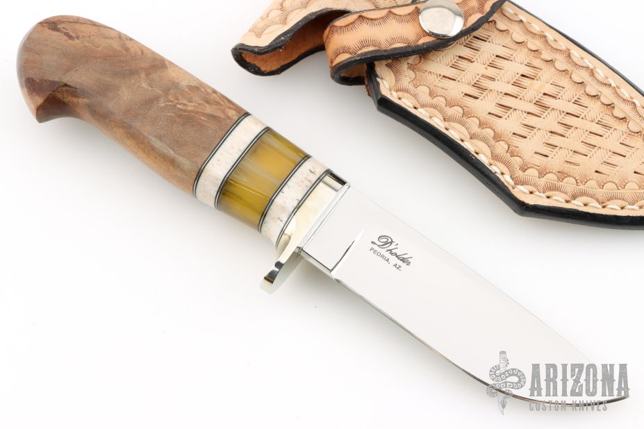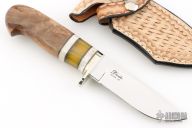 This Knife by D'Alton Holder features a mirror polished blade with .177" blade thickness and 1.134" blade depth, hidden tang construction. The handle has a nickel silver guard, stabilized maple burl grip with with blank/nickel silver/oosic/amber spacers. Comes with a hand tooled brown leather sheath. Has a couple light scratches, otherwise Excellent condition.