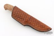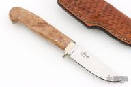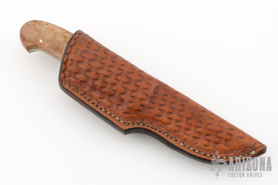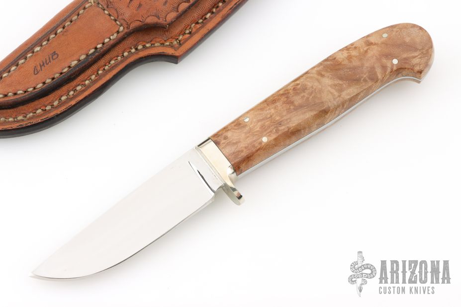 This knife by D'Alton Holder features a mirror polished blade with .192" blade stock and .941" blade depth, tapered tang construction. The handle has a nickel silver guard and pinned maple scales. Comes with a hand tooled brown leather sheath. Has a couple light scratches, otherwise Excellent condition.