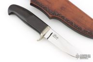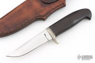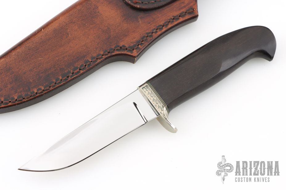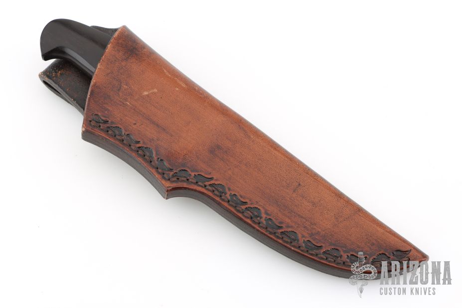 This knife by D'Alton Holder features a mirror polished blade with .188" blade stock and 1.016" blade depth, hidden tang construction. The handle has an engraved nickel silver guard and contoured wood grip. Comes with a hand tooled brown leather sheath. Has a couple light scratches, otherwise Excellent condition.