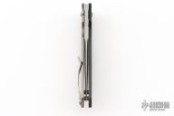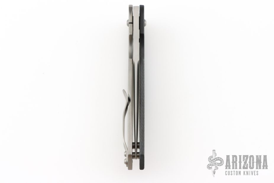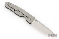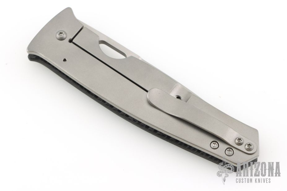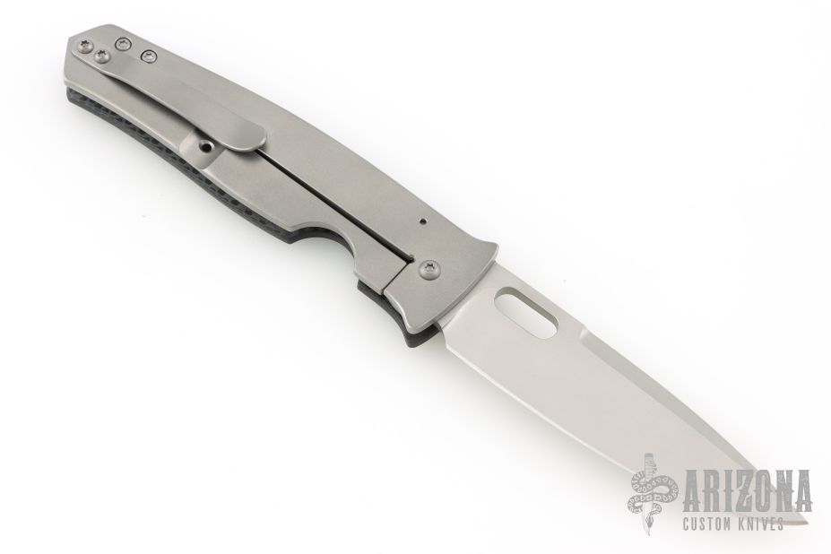 This Covert Dr. Death 6K folder by Tom Mayo features a Stellite 6K blade with a fine bead blast finish and thumbhole opening. The handle has a carbon fiber and bead blast titanium frame with titanium tip up clip, all titanium hardware. This knife is completely non-magnetic. Smooth action. Nice detent, blade seating and lockup. Includes a Velcro case. Excellent condition.