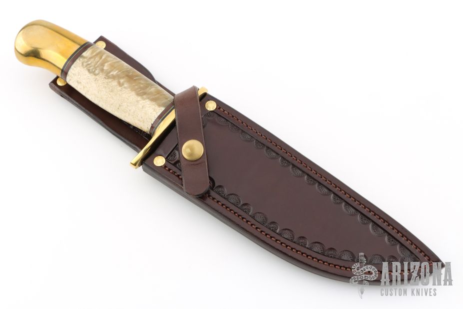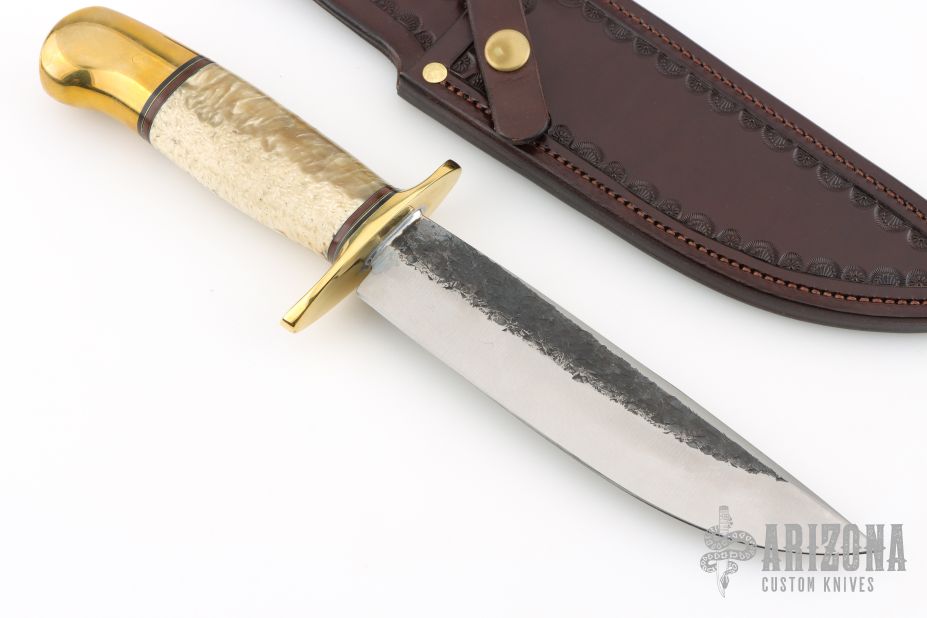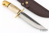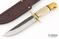 This Bowie by James Behring features a clip point blade with hammer marked flats and satin finished grinds, .260" blade stock and 1.385" blade depth, hidden tang construction. The handle has a brass guard, and pommel, with musk ox grip, brass/horse hide/black spacers. Comes with a hand tooled black leather sheath. Excellent condition.