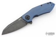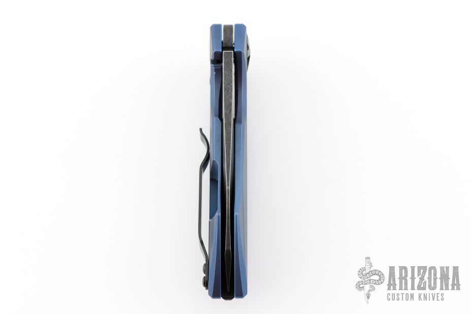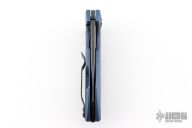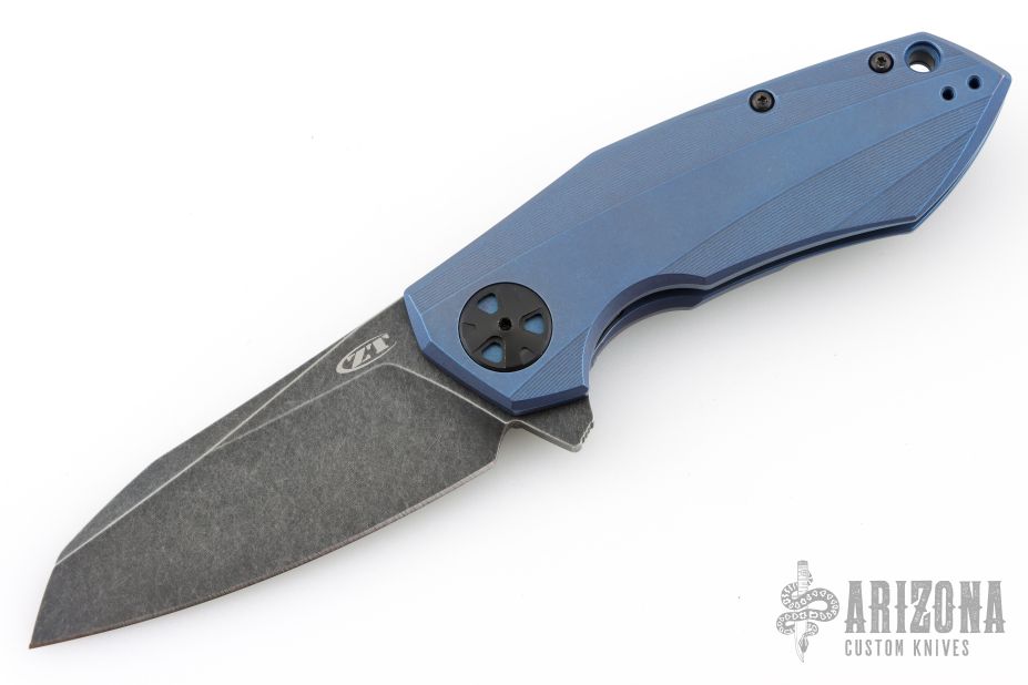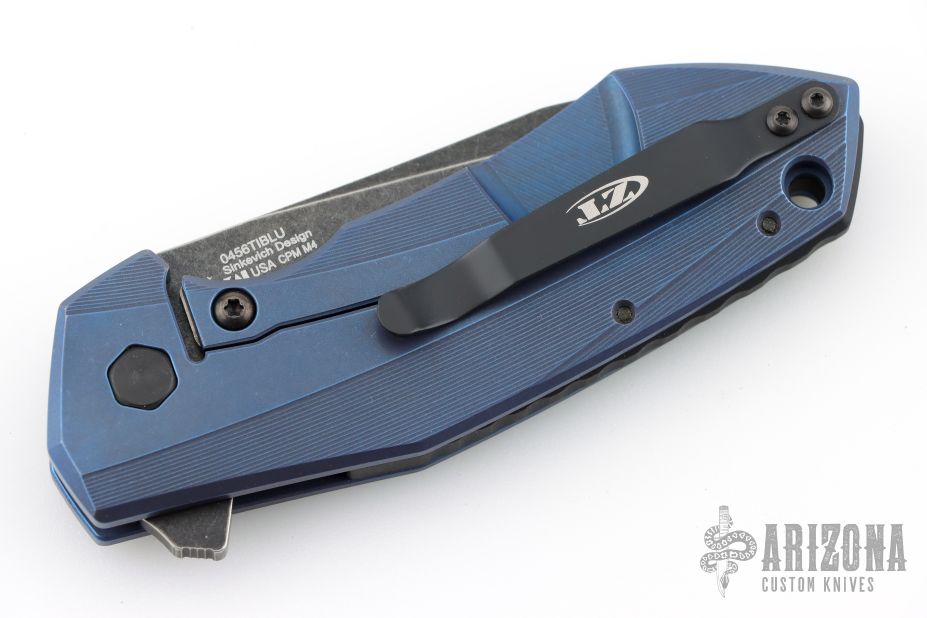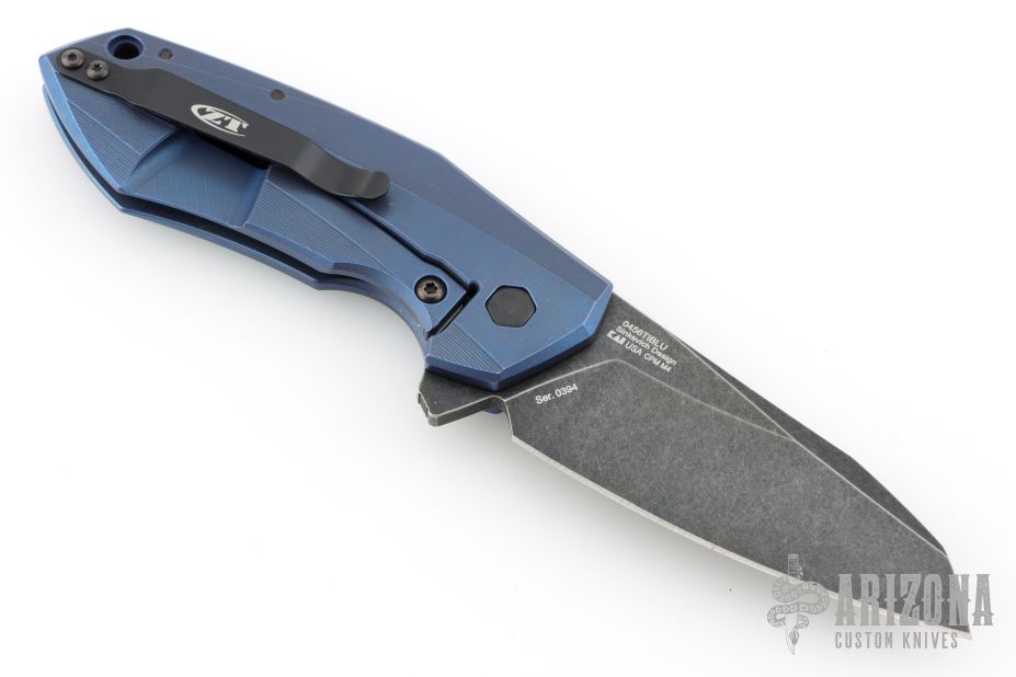 This ZT 0456 TI BLU by Zero Tolerance features an acid / tumble finished clip point blade with swedge and flipper. The handle has an anodized machined titanium frame over an anodized aluminum backspacer. Lanyard hole in pommel, black hardware, and stainless steel clip is positioned for tip up carry. Comes with original box and papers. Excellent condition. #0394
