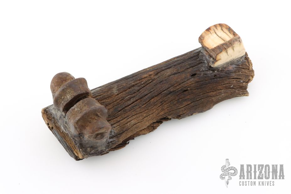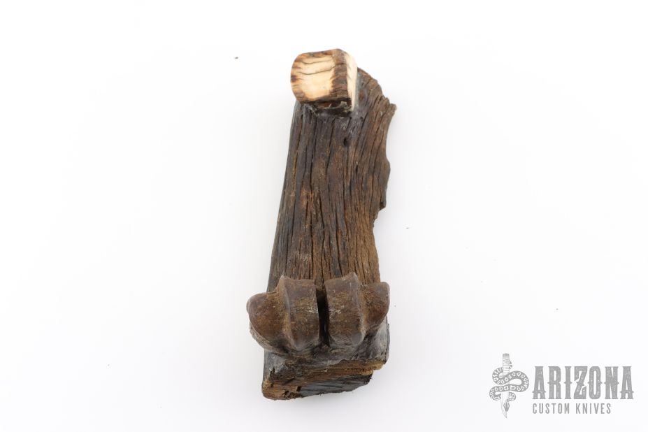 This custom knife stand by Miles Martin is made from fossil mammoth ivory, fossil bone from the same animal and Desert Ironwood. Has a slot in the top of the bone for the tip of a knife blade to rest in and a mammoth ivory piece for the butt to rest on. New from maker. Comes with COA. 8.5" overall, 7" from the bone to ivory stand points.