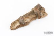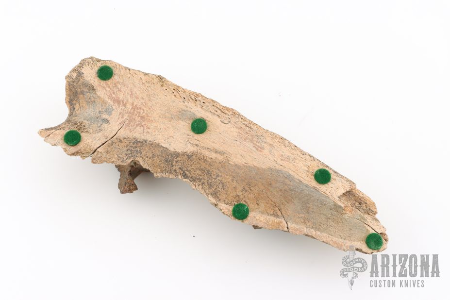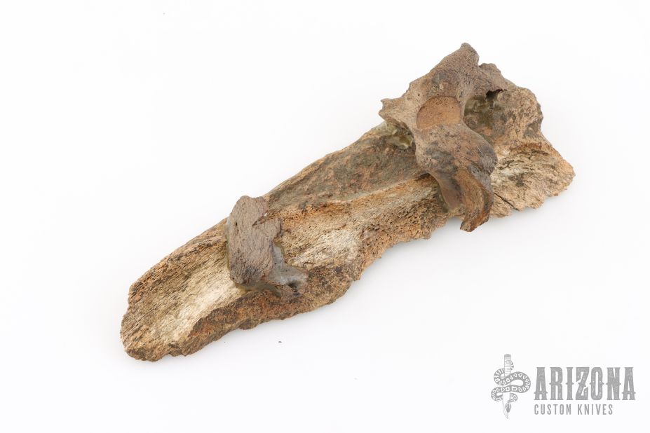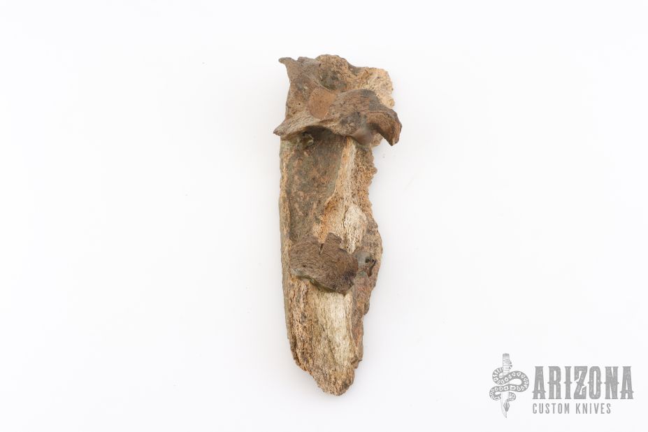 This custom knife stand by Miles Martin is made from fossil mammoth bones from the same animal. Has a slot in the top of the bone for the tip of a knife blade to rest in and a piece for the butt to rest on. New from maker. Comes with COA. 11.5" overall, 5" between the stand points.