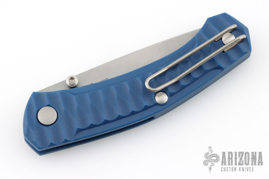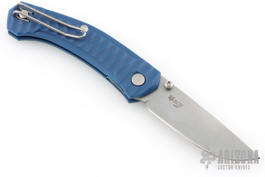 This ACE Iona model is built with a satin finished blade and a blue G-10 handle with the Anso texture.