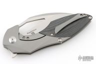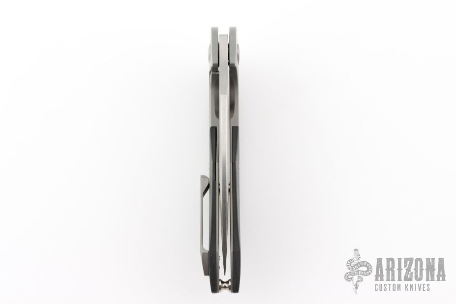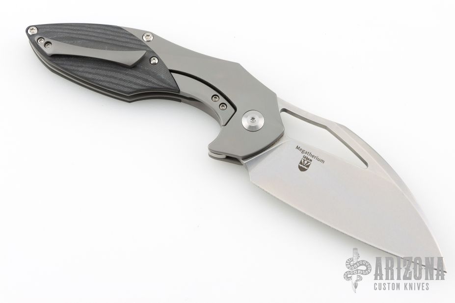 A folding Santoku for the outdoor chef, the Megatherium is a showcase of the "edge below tab" flipper system of Isham's design. Its wide blade excels at tasks requiring a firm slicing motion and the pseudo-choil allows the user choke-up for delicate tasks. The flipper becomes hidden when the knife is opened for unobstructed optimal performance.