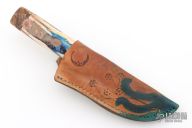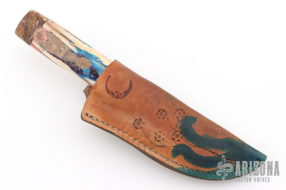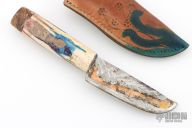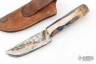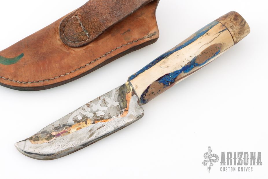 This knife by Miles Martin features a blade forged from Meteorite with copper and brass forged into the blade, has a 1095 cutting edge, .120" blade stock and 1.295" blade depth, hidden tang construction. The copper in the blade came from 1920s water pipes from under a school in Nenana Alaska. The handle has a mammoth ivory grip that has been stabilized with blue resin, has an Alaskan Birch Burl end cap. The Meteorite came from the Seymchan meteorite from Siberia Russia. Comes with a brown leather sheath with handmade brands on the front. New from maker. Comes with a COA.