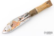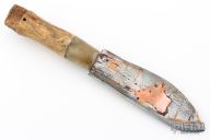 This knife by Miles Martin features a forged mosaic Damascus blade with copper forged into the blade, .232" blade stock and 2.155" blade depth, hidden tang construction. The copper came from 1920s water pipes from under a school in Nenana Alaska. The blade has enamel and brass inlays as well. The handle has ancient Eskimo artifact from Savonga, walrus oosic bone and wood. New from maker. Comes with a COA.