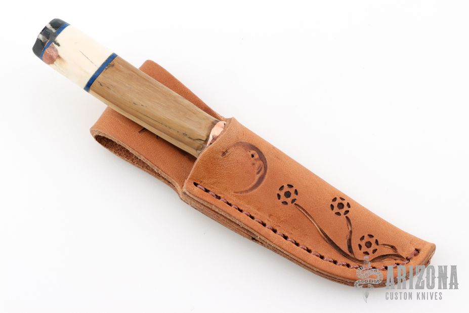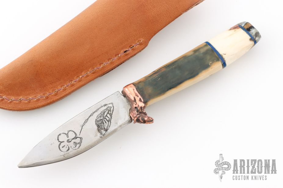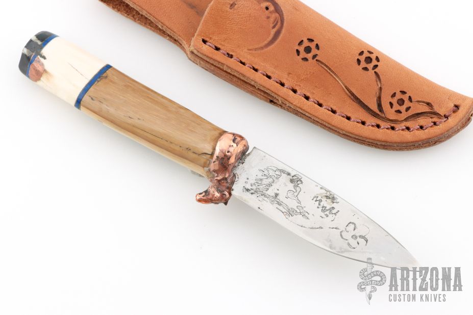 This knife by Miles Martin features a satin finished blade with acid etched flower motif with .061" blade stock and .870" blade depth, hidden tang construction. The handle has a lost wax cast copper moose head guard made from 1920s water pipes under a school in Nenana Alaska, mammoth ivory grip with mammoth tooth end cap. Comes with a brown leather sheath that has been branded by handmade stamps. New from maker. Comes with a COA.