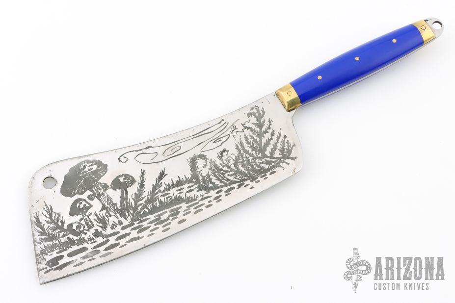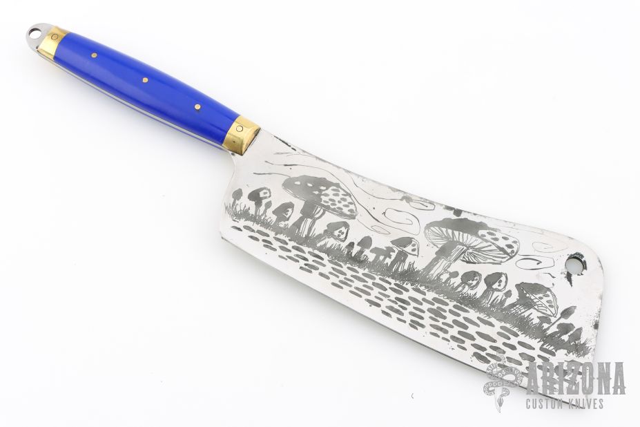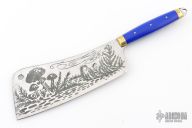 This Custom Kitchen Cleaver by Miles Martin features a satin finished blade with an acid etched mushroom scene, .092" blade stock and 2.942" blade depth, full tang construction. The handle has bronze bolsters, synthetic blue lapis scales with brass pins, lanyard hole at the butt. Comes with a COA. New from maker.