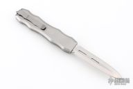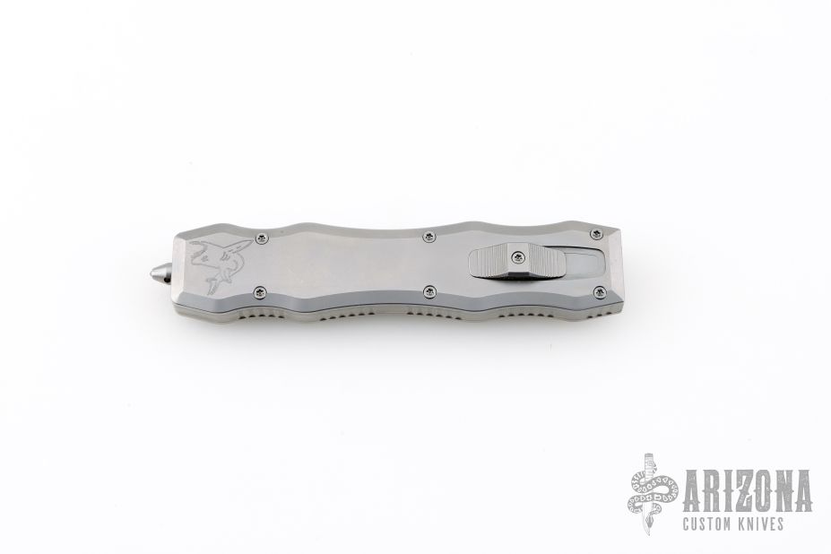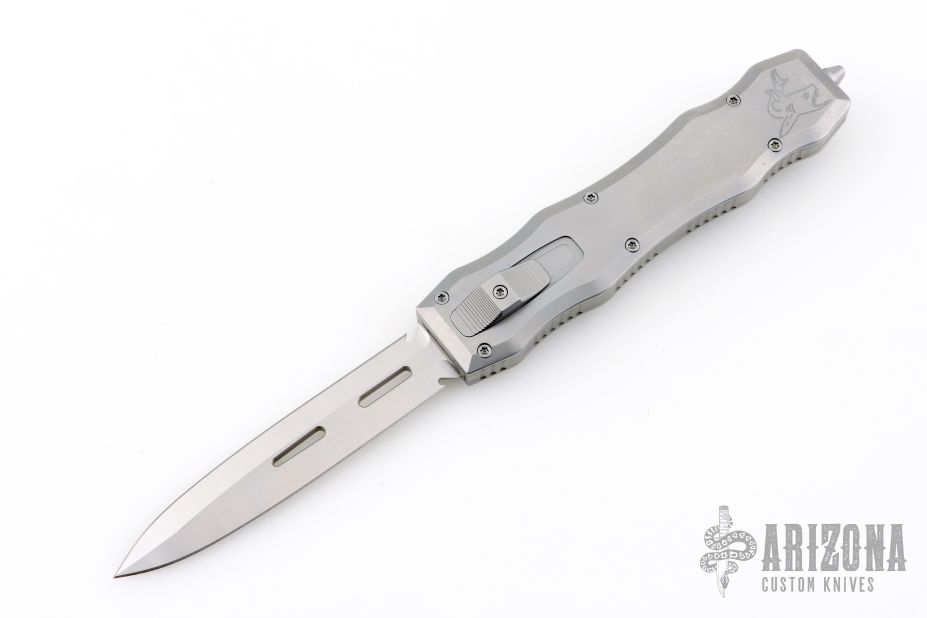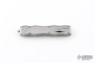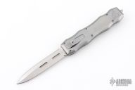 This Brand New Sand Shark OTF double action automatic by Desert Knife Works features a satin finished double edge blade and a bead blasted stainless steel handle with matching tip down clip. Has a few light scuffs, otherwise excellent condition.