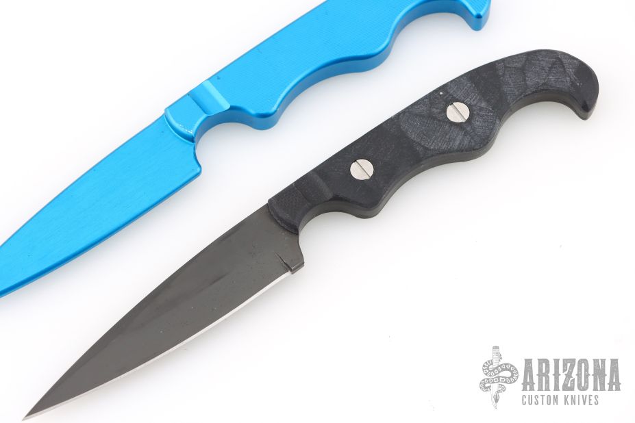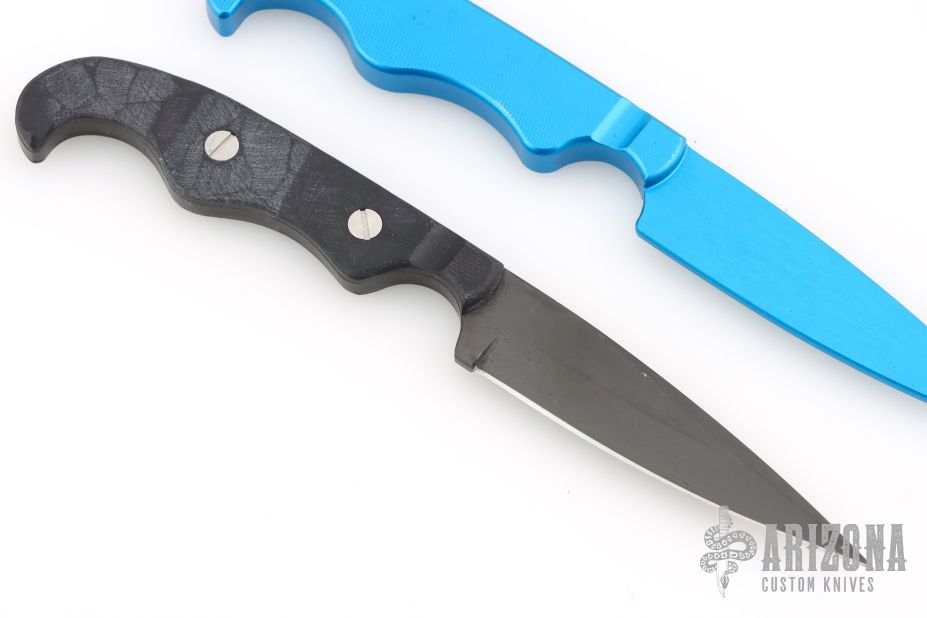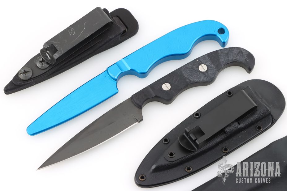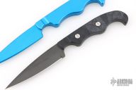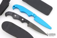 This RAT Training Package from Headhunter Blades was designed by Sayoc Kali Instructor Guy Harley Elmore. It includes a fixed blade, a trainer and front pocket sheaths with clips for both. The knife features a black oxide coated drop point blade with swedge, .129" blade stock and .783" blade depth, full tang construction. The handle is comprised of textured black G10 scales. The trainer is an exact replica of the live blade, with a couple small but important changes. The anodized blue color is a safety standard in military training. All inert training devices are blue. (blue guns, blue training knives, blue claymores, etc.) The tip of the RAT Trainer is 0.5"" shorter than the real blade. When you practice with a trainer, you touch your target with the tip but cannot enter the target. This shorter design builds an automatic half inch penetration into your targeting and negates the training scar created by using trainers. Includes original box, papers, pocket sheaths for both blades. Has a couple light scuffs and scratches, excellent condition otherwise.