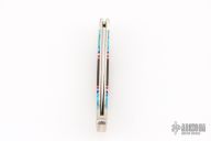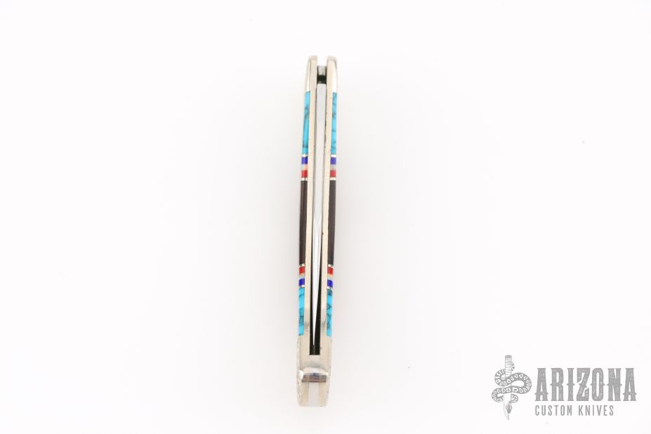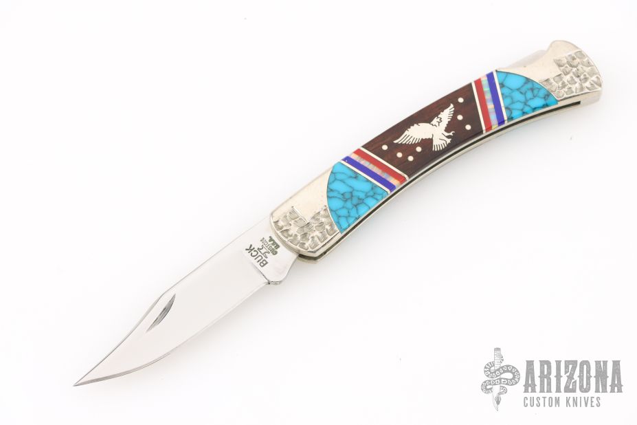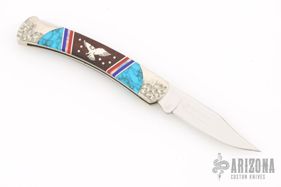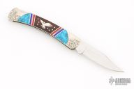 This Buck lockback has been customized by Brian Yellowhorse. The blade features a mirror polished clip point blade with a nail nick. The handle features a carved nickel silver frame, turquoise and desert ironwood inlays with nickel silver eagles, multi-color spacers. Excellent condition. #224/500
