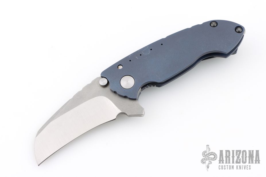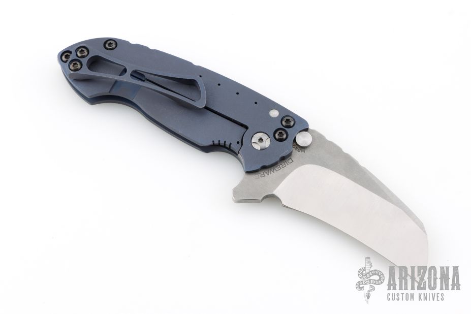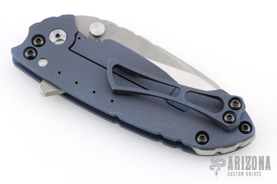 This Solo Flipper by Direware Custom Knives features a satin finish blade with stonewashed flats, swedge, notched thumbrest, dual blade stops and flipper. The handle has a bead blasted and anodized titanium frame with a matching titanium clip is positioned for tip up carry, stainless steel backspacer. Rides on bearings, nice detent, lockup and blade seating. Has some scuffs on the frame, otherwise excellent condition.
