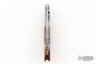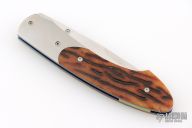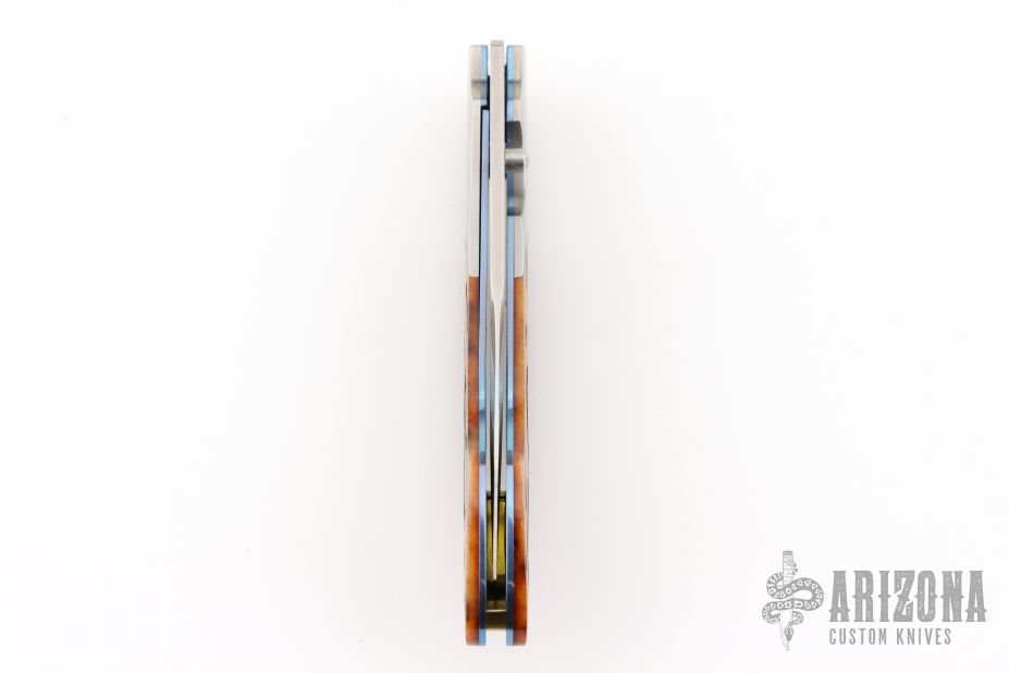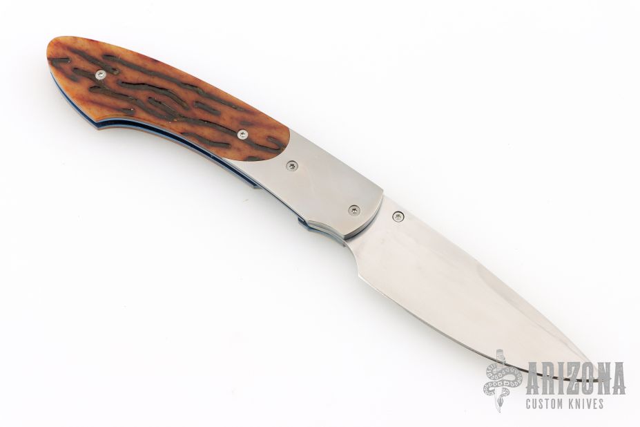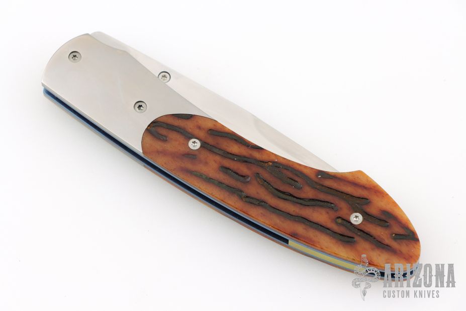 This spearpoint K22-RB folding knife from William Henry features a hand-rubbed satin finished blade, orange peel titanium bolsters, and groove amber bone scales. Anodized titanium liners and backspacer. Comes with original box. Has some light scratches. Excellent condition otherwise.