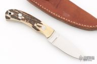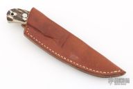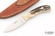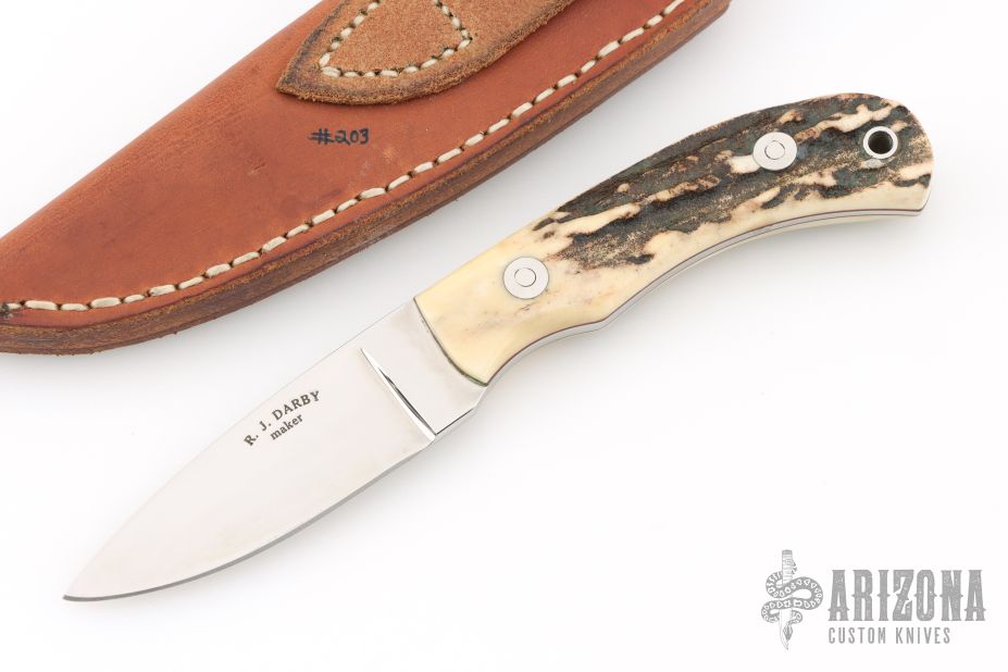 This knife by RJ Darby features a mirror polished blade with .149" blade stock and .970" blade depth with tapered tang construction. The handle has stag covers, red liners, and loveless bolts. #203 on the blade. Comes in a leather belt sheath. Has a couple light scratches, excellent condition otherwise.