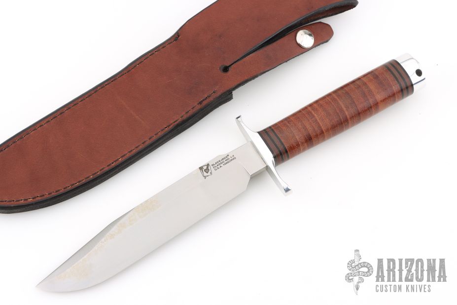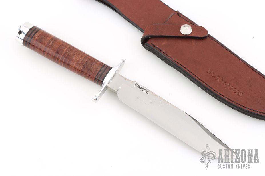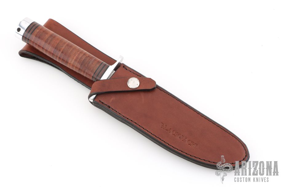 This Model 1-7 by Blackjack Knives features a satin finished blade with a false top edge, .236" black stock and 1.260" blade depth, hidden tang construction. The handle has an aluminum guard, stacked leather grip with red/black spacers, aluminum butt with lanyard hole. Comes with brown leather sheath and original box. Has some oxidation spots on the blade, otherwise excellent condition.